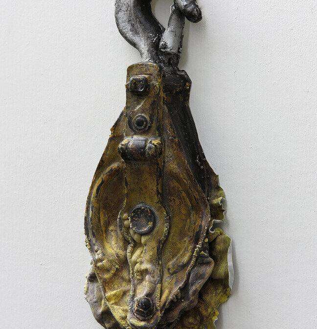 今回の展示では、自身が長年使用していた工具やリサイクルショップで見つけた古びた工具を版にして制作をしている。様々な用途で使用された工具には、携わった人の痕跡や経年劣化の跡が刻まれている。中にはひどく錆びついたり、大きく歪んだりして本来の機能を果たせない物も多くある。その趣には人と対峙するかのような不思議な感覚があった。剥がしとった皮膜は薄く不安定な状態でありながら、多様な思考や感情が入り込める余白のような存在としてありたいと願っている。